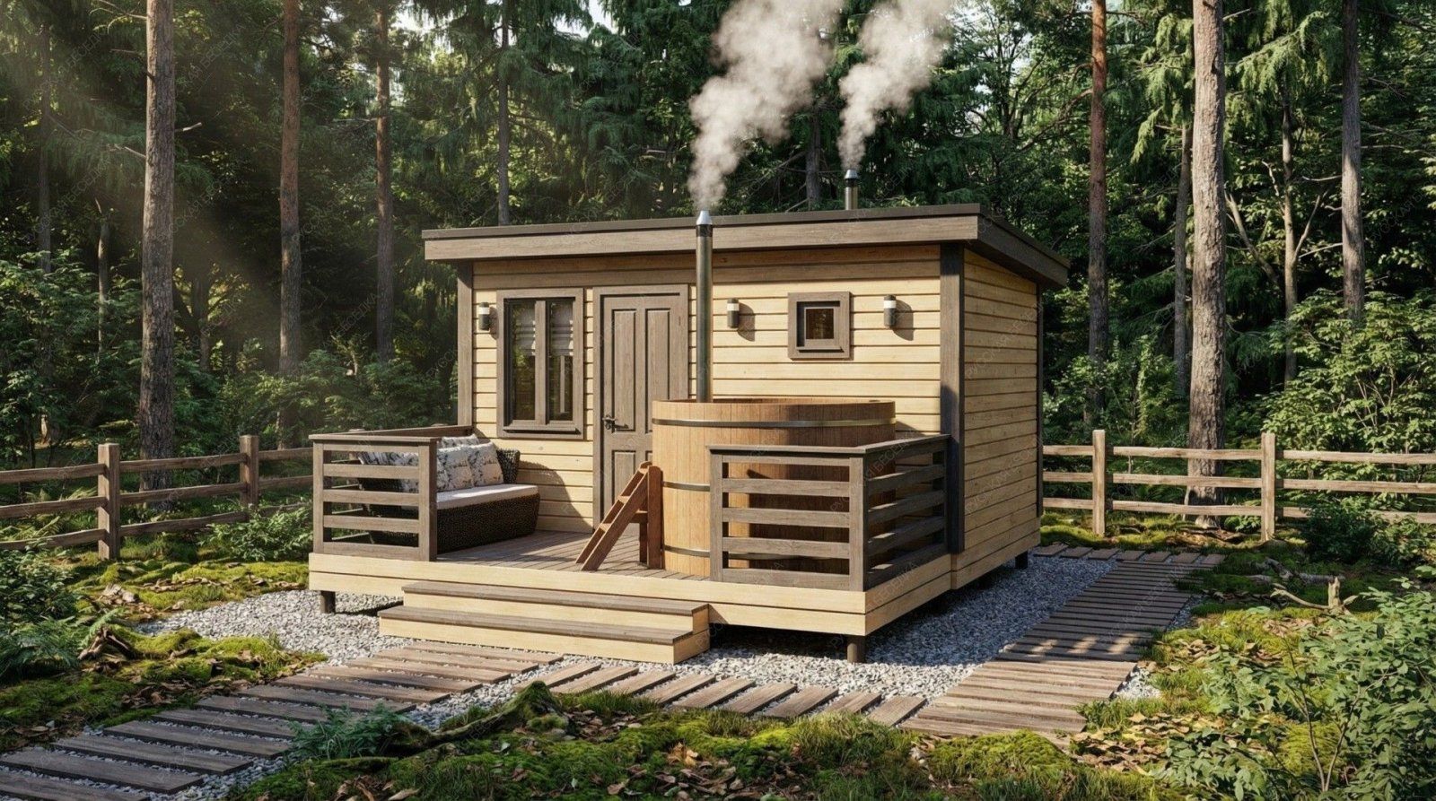 Баня «Аркадия» представляет собой компактное и продуманное до мелочей решение для ценителей традиционных банных ритуалов с элементами современного комфорта. Модель с открытой террасой эффективно использует пространство, создавая многофункциональную зону для отдыха и релаксации на свежем воздухе площадью 8,73 м².  Внутренняя планировка отличается рациональностью: объединенная парная-мойка (5,03 м²) с деревянным окном-форточкой обеспечивает правильный пар и удобство проведения процедур. Уютная комната отдыха (5,98 м²) становится теплым и гостеприимным местом для чаепития и общения после пара. Односкатная крыша и общие габариты (2,95х4,5 м + терраса 2,1х4,5 м) придают строению современный динамичный силуэт, гармонично вписывающийся в ландшафт.  Этот проект идеально подходит для участков, где важна оптимизация площади без ущерба для функциональности и атмосферы. Качество материалов и строительства гарантирует энергоэффективность, долговечность и создание той особой целебной среды, ради которой и строится настоящая русская баня.
