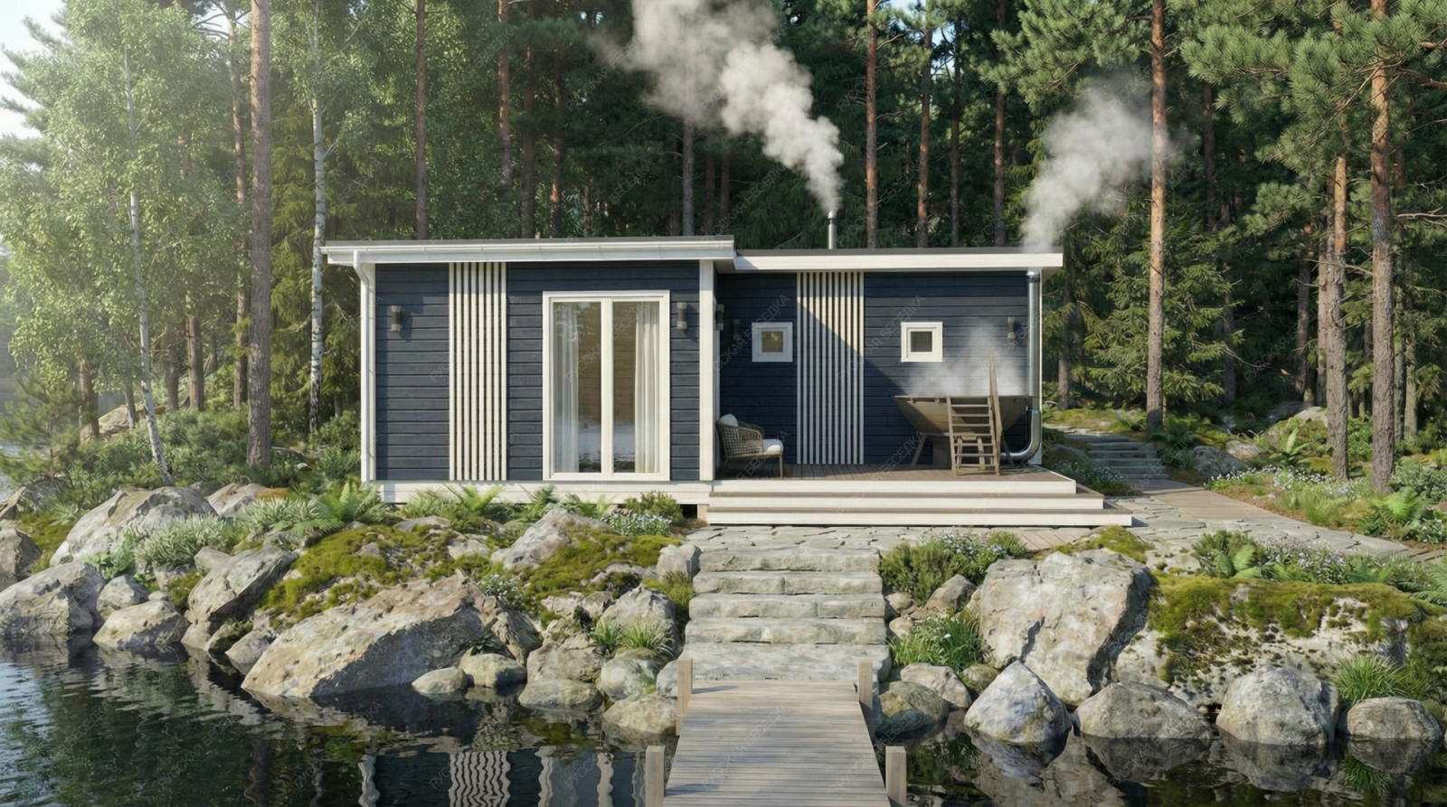 Баня «Монреаль» воплощает концепцию гармоничного пространства, где каждая зона спроектирована для максимального комфорта и расслабления. Обширная открытая терраса площадью 13,28 м² является ключевым элементом архитектуры, плавно продолжая внутреннее пространство и создавая идеальную площадку для отдыха на свежем воздухе, где отлично может расположиться традиционный банный чан для контрастных водных процедур.  Внутренняя планировка отличается продуманной логистикой и комфортом. Просторная комната отдыха (15,9 м²) легко трансформируется в гостиную или столовую, вмещая большую компанию. Функциональная парная (4,83 м²) с деревянным окном-форточкой обеспечивает правильный температурный режим, а отдельная помывочная (3,06 м²) и санузел повышают уровень бытового удобства, делая строение полностью автономным. Односкатная крыша и солидные габариты (5,95х7,5 м) формируют современный, лаконичный экстерьер.  Качественный конструктив из отборной древесины гарантирует долговечность и отличные теплосберегающие свойства. Этот проект предлагает не просто баню, а целый гостевой павильон с акцентом на размеренный отдых и общение, где детали работают на создание завершенной атмосферы загородного релакса.
