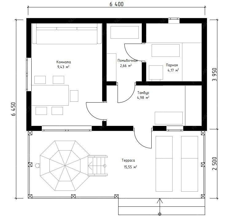 Баня «Солана» демонстрирует удачное сочетание компактных габаритов и продуманной эргономики, где центральная роль отведена просторной открытой террасе площадью 15,55 м². На ней обустроено специальное место для размещения банного чана, превращающее эту зону в полноценный центр водного релакса после парных процедур.  Особенностью внутренней планировки является наличие функционального тамбура площадью 4,98 м², который эффективно сохраняет тепло в основных помещениях и служит техническим буфером. Уютная комната отдыха (9,43 м²) обеспечивает комфортное пребывание, а изолированные парная (4,17 м²) с окном-форточкой и помывочная поддерживают правильный банный микроклимат и гигиеничность.  Классическая двускатная крыша и сбалансированные пропорции строения (3,95х6,4 м) формируют традиционный и эстетичный внешний вид. Качественный конструктив из натуральной древесины гарантирует долговечность и отличное теплосбережение. Данный проект оптимален для участков, где важно рационально использовать площадь, не отказываясь от ключевых элементов современного банного комплекса — террасы для отдыха и возможности установки купели.