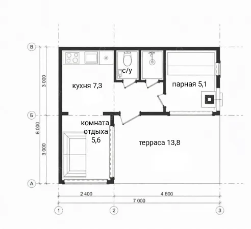 Каркасная баня «Таволга» с габаритами 6х7 метров под односкатной крышей предлагает эффективную планировку общей площадью 42 кв.м. Ее ключевая особенность — наличие полноценной кухни площадью 7.3 кв.м., что трансформирует объект из просто бани в автономное место для гостеприимства и продолжительного отдыха. Функциональная парная 5.1 кв.м., санузел и компактная комната отдыха образуют продуманный банный блок. Односкатная крыша придает сооружению современный и лаконичный внешний вид. Значительным преимуществом является открытая терраса площадью 13.8 кв.м., органично дополняющая внутреннее пространство и создающая плавный переход к окружающей среде. Такая компоновка идеальна для любителей совмещать оздоровительные процедуры с последующим застольем или чаепитием на свежем воздухе, не покидая пределов комфортного комплекса. Проект оптимален для участков, где требуется максимум функциональности при компактных размерах.