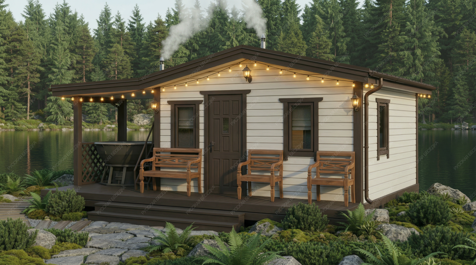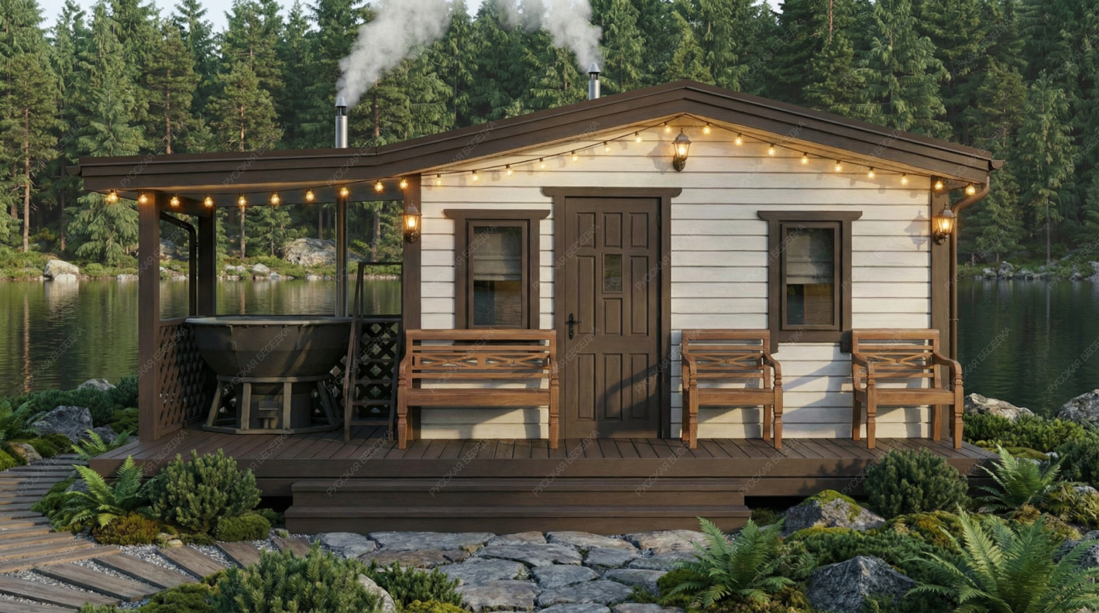 Баня «Велма» выделяется продуманной архитектурой, где открытая терраса становится многофункциональным пространством для полноценного отдыха. Ее ключевая особенность — специально предусмотренный выступ на просторной площадке (15,53 м²), идеально подходящий для установки банного чана, что позволяет создать полноценный СПА-комплекс под открытым небом.  Внутренняя планировка построена на принципах удобства и функционального разделения. Просторная комната отдыха (11,64 м²) создает атмосферу для приема гостей, а наличие отдельного санузла значительной площади (2,22 м²) добавляет бытового комфорта. Классическая парная (5,55 м²) с окном-форточкой и изолированная помывочная обеспечивают правильный микроклимат и гигиеничность процедур. Надежная двускатная крыша и общие габариты (4,85х5,5 м) формируют солидный и традиционный экстерьер строения.  Использование качественных материалов и точный конструктив гарантируют долговечность и эффективное теплосбережение. Данный проект предлагает комплексное решение, где удачно сочетаются классическая банная культура и современные элементы оздоровительного отдыха, делая террасу с чаном логическим центром притяжения всего строения.