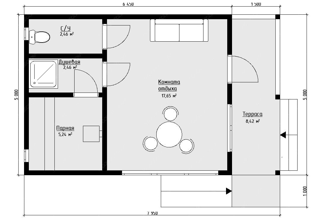 Каркасная баня «Керила» с односкатной крышей и габаритами 5х8 метров предлагает продуманную Г-образную планировку общей площадью 40 кв.м. Такая конфигурация эффективно разделяет пространство на функциональную и релаксационную зоны. Технологичная часть включает парную 5.24 кв.м., душевую и санузел, каждая площадью 2.46 кв.м., что обеспечивает комфортное последовательное прохождение всех этапов банного ритуала. Основной акцент смещен на просторную комнату отдыха площадью 17.65 кв.м., которая напрямую связана с открытой террасой 8.42 кв.м. Подобная интеграция формирует единое светлое пространство для приема гостей, плавно перетекающее в зону отдыха на свежем воздухе. Каркасная конструкция гарантирует оперативный монтаж и высокую энергоэффективность. Односкатная крыша подчеркивает современный лаконичный дизайн. Проект представляет собой сбалансированный вариант для тех, кто ценит четкое зонирование, возможность совместить процедуры с гостеприимством и современный архитектурный подход.