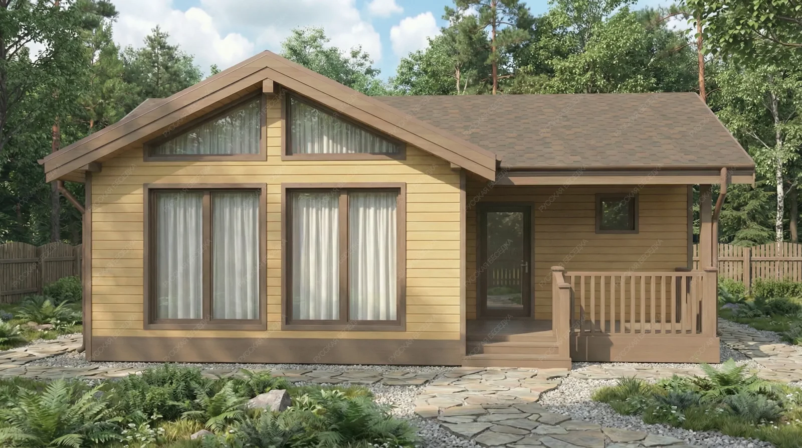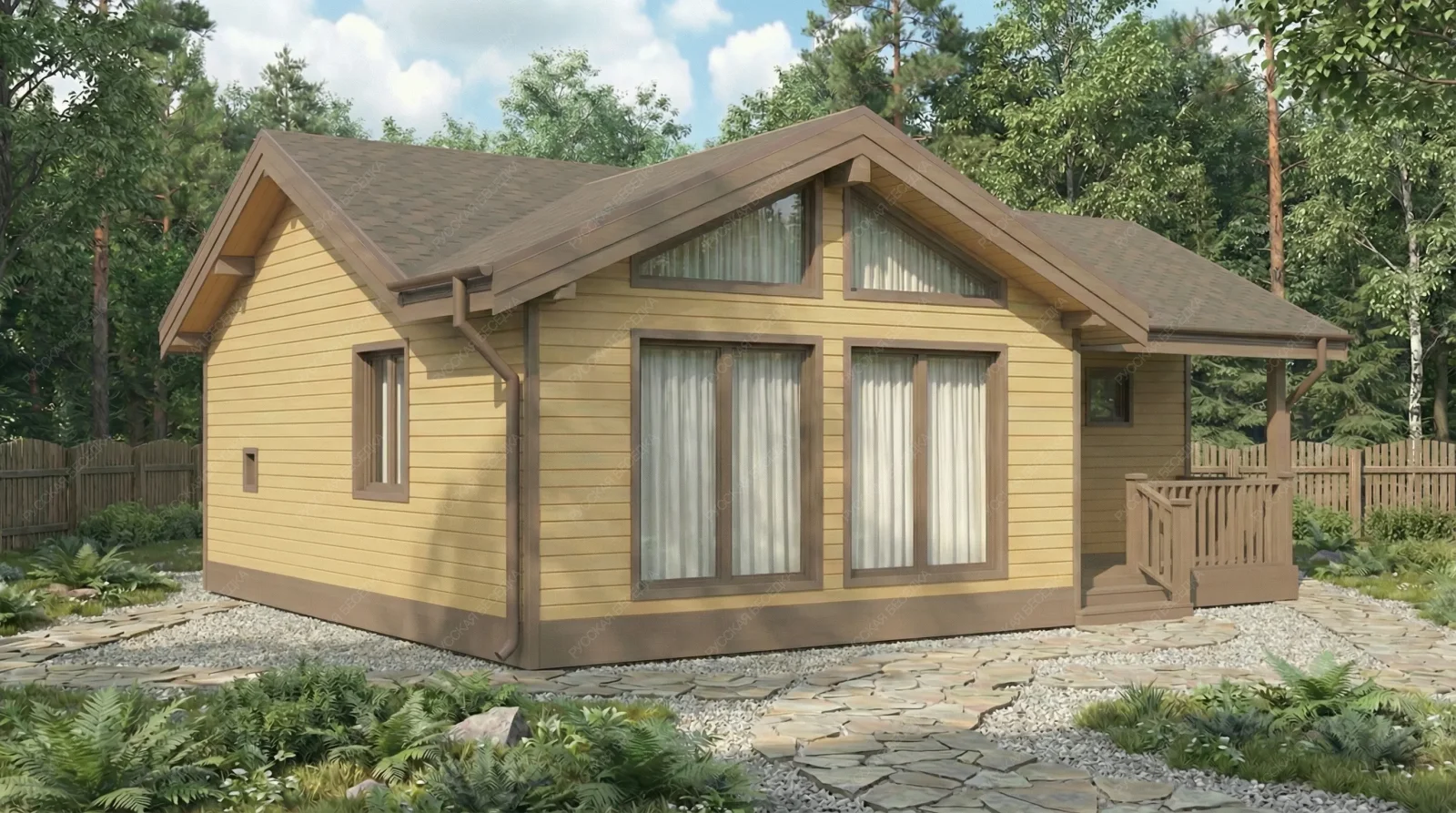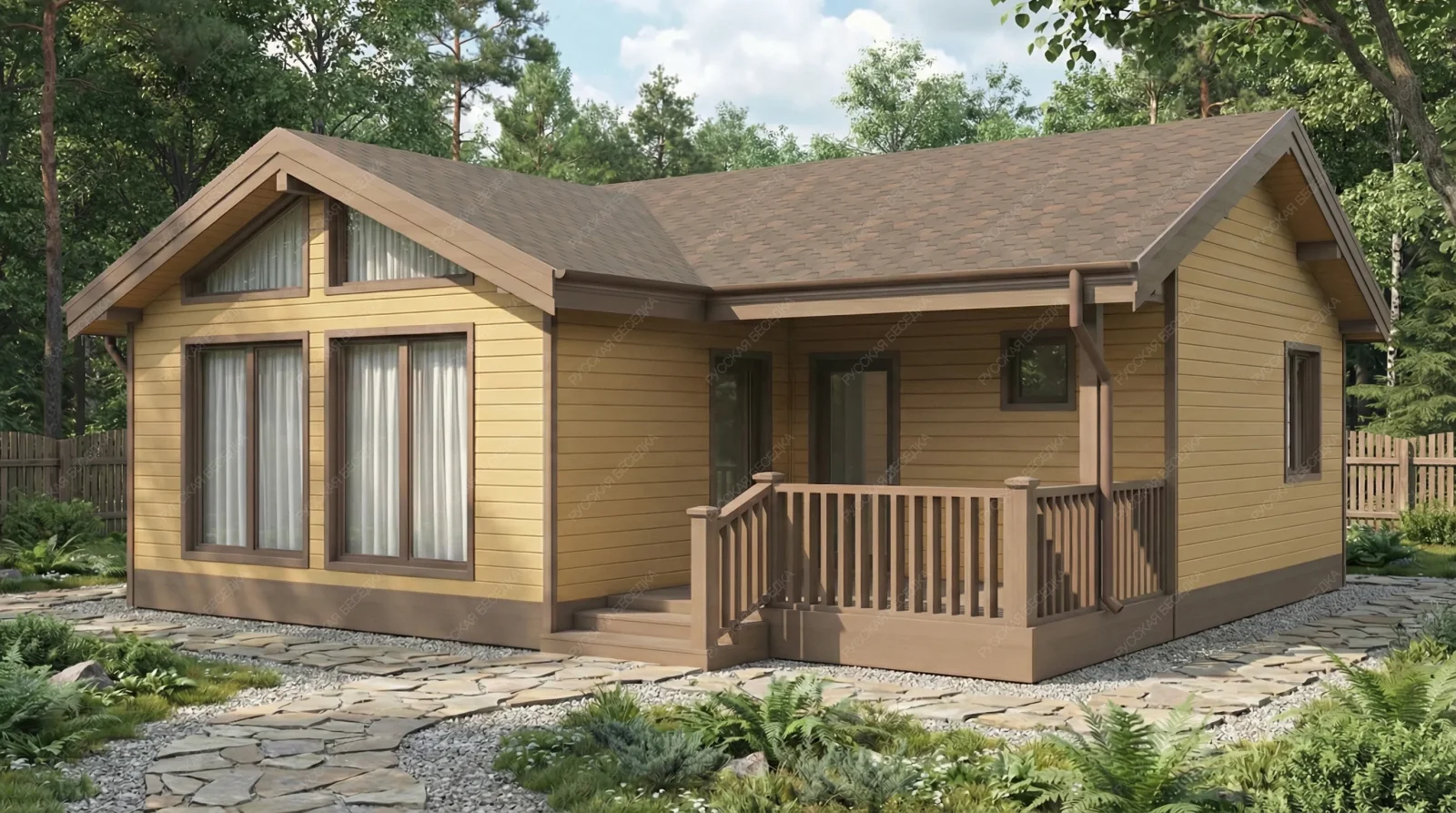 Каркасная баня «Хэлли» с габаритами 9,4х9 метров и выразительной многоскатной крышей представляет собой архитектурно сложный и функционально насыщенный проект площадью 84 кв.м. Многоскатная кровля не только формирует запоминающийся силуэт, но и обеспечивает оптимальное распределение снеговых и ветровых нагрузок, подчеркивая статусный характер строения. Внутреннее пространство организовано по принципу полноценного гостевого дома. Панорамное остекление наполняет комнату отдыха площадью 27,5 кв.м. естественным светом, визуально объединяя интерьер с окружающим ландшафтом. Отдельная спальня 12,3 кв.м. превращает баню в объект для продолжительного проживания и комфортного ночлега. Продуманная планировка включает просторную душевую 9 кв.м., парную 7,5 кв.м., санузел и тамбур, обеспечивающий тепловой буфер. Терраса 10,3 кв.м. служит естественным продолжением гостиной зоны. Каркасная технология гарантирует оперативное возведение и высокие теплоизоляционные характеристики при значительной площади строения. Данный проект предназначен для создания многофункционального семейного комплекса, где традиционная баня дополнена возможностями загородной резиденции с акцентом на светлую архитектуру и панорамные виды.