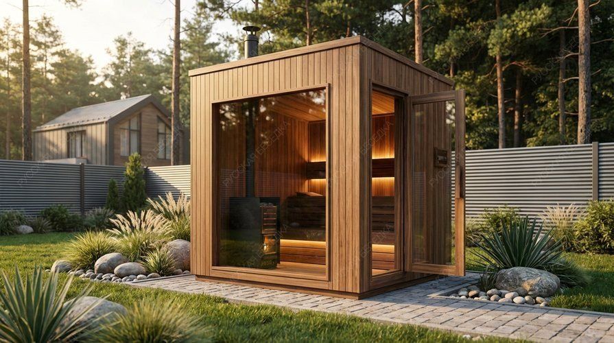 Модульная баня «Ясень» представляет собой предельно концентрированное решение площадью 4,4 кв.м. при габаритах 2х2,2 метра под односкатной крышей. Её философия — минимализм, доведенный до абсолютной чистоты формы и функции. Пространство состоит исключительно из парной, где каждый элемент подчинен цели глубокого расслабления. Главной и единственной особенностью является полное панорамное остекление одной из стен и такая же дверь, превращающие компактный объём в идеально интегрированный в ландшафт объект. Это создаёт эффект полного растворения в природе, где граница между теплом внутреннего пространства и свежестью сада становится условной. Односкатная кровля добавляет современной геометричности. Модульная конструкция обеспечивает мгновенную готовность к использованию после доставки на участок. Данный проект — идеальный выбор для ценителей радикального минимализма, высокой скорости организации личного спа-пространства и созерцательного отдыха, где ничто не отвлекает от контакта с окружающей средой.
