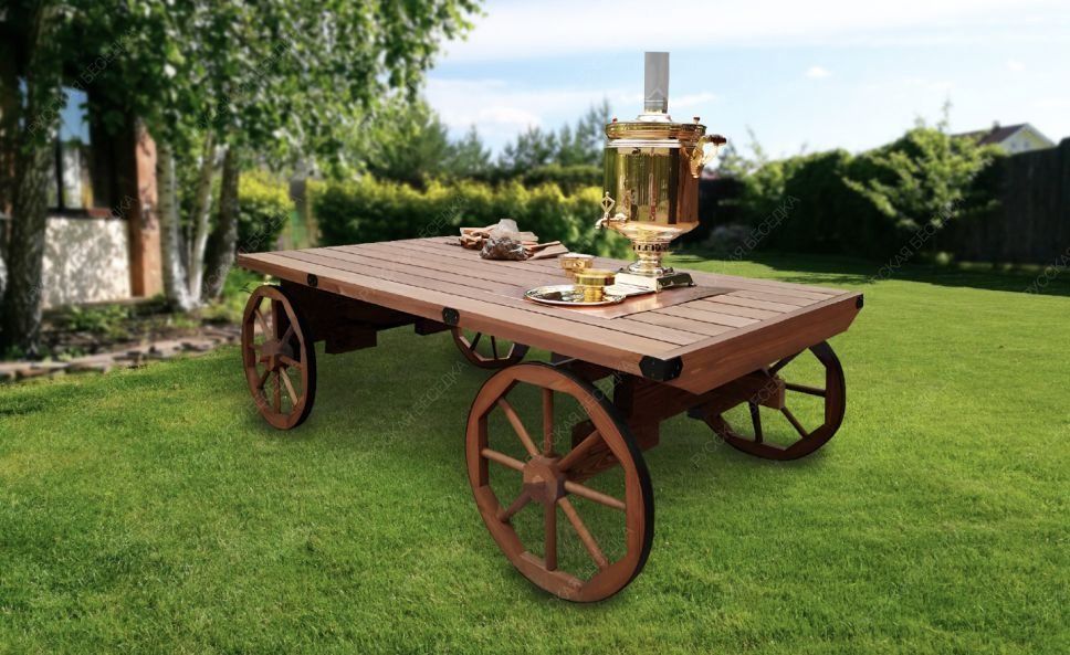 Изделия с колесами всегда привлекательны и интересны. А самая настоящая деревянная телега с функциональными колесами просто создана для того, чтобы быть в центре внимания. В данном случае она используется не в качестве повозки, как в старину, а по другому предназначению - как стол. Такая деревянная телега может использоваться на ярмарке, на приусадебном участке или в ресторане.