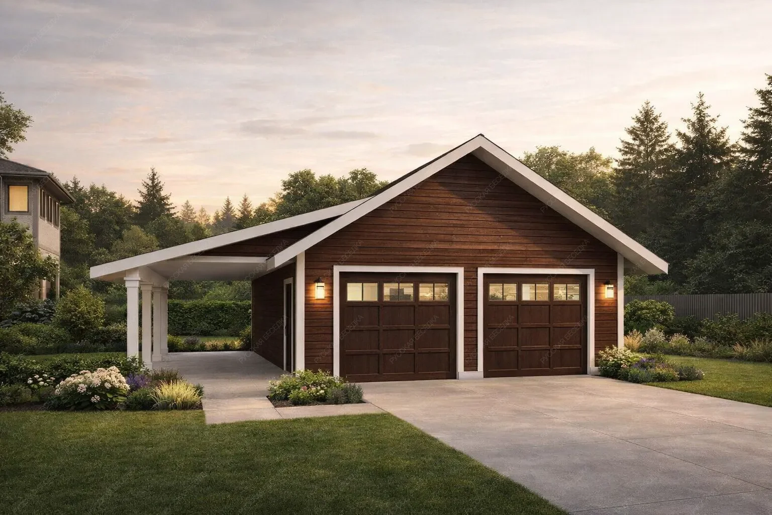 Деревянный гараж — это не только удобное и функциональное сооружение, но и отличная возможность дополнить архитектурный стиль вашего участка. Деревянные конструкции остаются вечной классикой, так как дерево — экологически чистый и натуральный материал. Одним из основных преимуществ деревянных гаражей является их доступная цена, что делает их более выгодным вариантом по сравнению с постройками из других материалов. При правильном строительстве деревянный гараж может служить десятилетиями, сохраняя все свои свойства и привлекательный внешний вид. Мы заботимся о качестве наших конструкций, обрабатывая древесину надёжными пропитками, которые защищают от гниения и плесени. Огнебиозащитные средства обеспечивают устойчивость к влаге, ультрафиолетовому излучению, перепадам температуры и другим атмосферным воздействиям. Кроме того, мы можем предложить утепление гаража, учитывая важность пароизоляции для сохранения тепла и защиты конструкции. Индивидуальное проектирование позволит вам точно вписать гараж в экстерьер вашего участка и оптимально спланировать внутреннее пространство для удобства использования. Создайте идеальное место для хранения вашего автомобиля и оборудования с нашим деревянным гаражом!