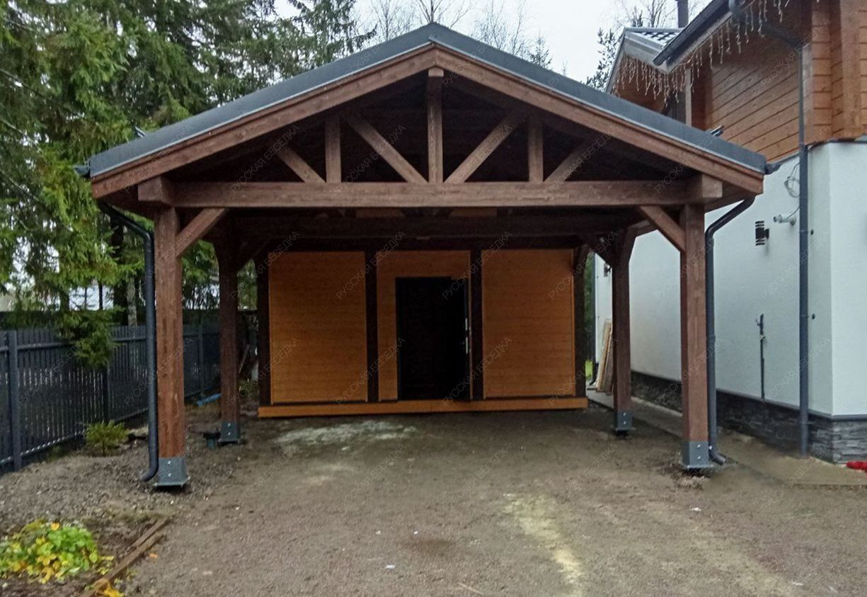 Навес из дерева послужит отличным парковочным местом для одного или нескольких автомобилей.