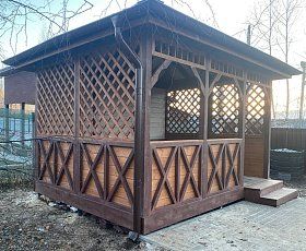 Беседка выполненная из лучших пород древесины, прослужит долгие годы и не потребует особого ухода и обслуживания. Специальные лакокрасочные материалы которые мы используем, предотвратят старение, гниение и заражение грибком конструкции кухни. Используемая огнебиозащита образует полупрозрачное полуматовое покрытие, стойкое к влаге, УФ-излучению, перепадам температуры и другим атмосферным воздействиям.