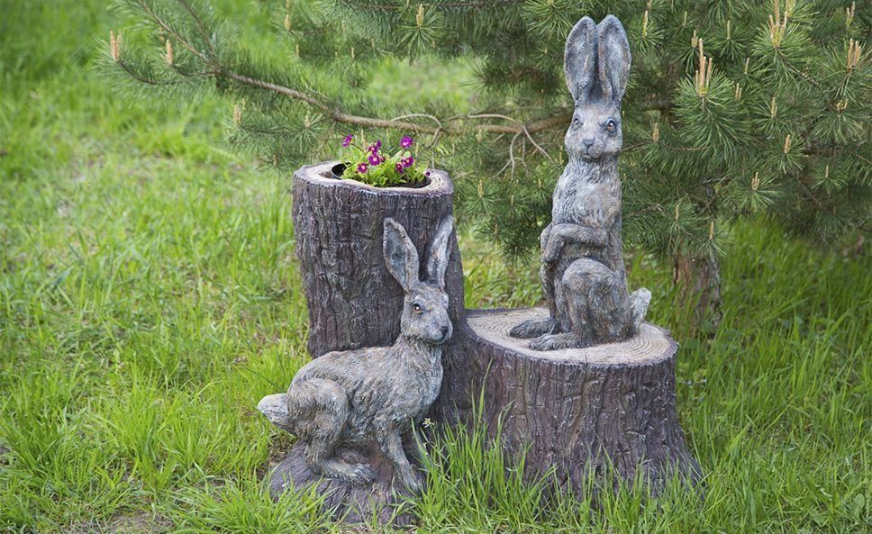Садовая фигура (цветник) «Зайцы на пне» украсит поляну или дополнит цветник, впишется в ландшафт, обогатит красотой природы и диких животных ваш участок. Фигурка изготовлена из прочного, лёгкого стеклопластика, противоударная и влагостойкая, не боится изменения температуры, сохранит на долгие годы первозданный вид.                                                                                                                                                                Большие вазоны, выполненные в виде садовых скульптур, преображают любой дачный участок. Они позволяют создать уникальный, неповторимый дизайн вашей дачи, который будет прекрасно заметен и летом и зимой. Многие вазоны такого типа имеют яркие расцветки. Но, пожалуй, выигрышнее всего растения любых видов будут смотреться в вазонах однотонных. Ещё лучше, если это будут изделия под цвет дерева. Ведь природа уже позаботилась о том, чтобы все оттенки дерева хорошо сочетались с зеленью и любыми цветами.                           Вазоны для сада из полиэфирной смолы и стеклопластика прослужат вам максимально долгое время. Вне зависимости от того, в каком климате вы живёте, насколько вы заботливые владельцы или насколько у вас аккуратные посетители и гости, эти элементы декора надолго сохранят привлекательный внешний вид - их даже не обязательно убирать в сухое место на зиму. Вазоны для цветов уличные используются для посадки как однолетних, так и многолетних цветов. В них отлично смотрятся вьющиеся виды растений, которые ещё больше выигрывают при посадке с ярко цветущими цветами. Преимущество этого вида цветников в том, что их можно поставить там, где другие виды неуместны. Например, на террасе, веранде или во внутреннем дворике. Фигура зайца встречается не очень часто в оформлении дачных участков, но нам думается, эта тенденция изменится. Как мы все знаем, заяц ассоциируется с некоторыми видами овощей, такими как морковь, капуста. Ещё ближе образ зайца приверженцам восточной культуры, где этот зверёк символизирует удачу, здоровье и изобилие - ровно то, чего всегда хочется чуточку больше на даче. Цветник зайцы на пне продаётся как по розничным ценам, так и по оптовым, в зависимости от общей стоимости заказа. Этот цветник, как и все наши изделия, изготовлен из экологически-чистых материалов. Его основная часть выглядит очень похожей на настоящее дерево, а детали зверей отлично прорисованы. Изделие подойдёт поклонникам натуралистичных стилей.